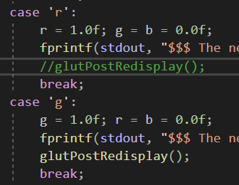 4번째 줄과 같이 case r의 glutPostRedisplay()를 주석처리하였더니,