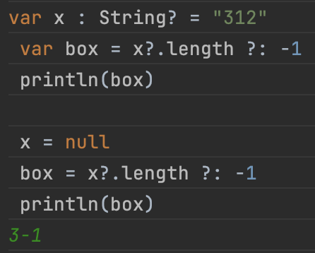 line 6에서는 x가 null로 바뀌었기 때문에(line 5) x?.length = null, ?:도 null을 만나 오른쪽의 -1을 최종 return하게 되었다.